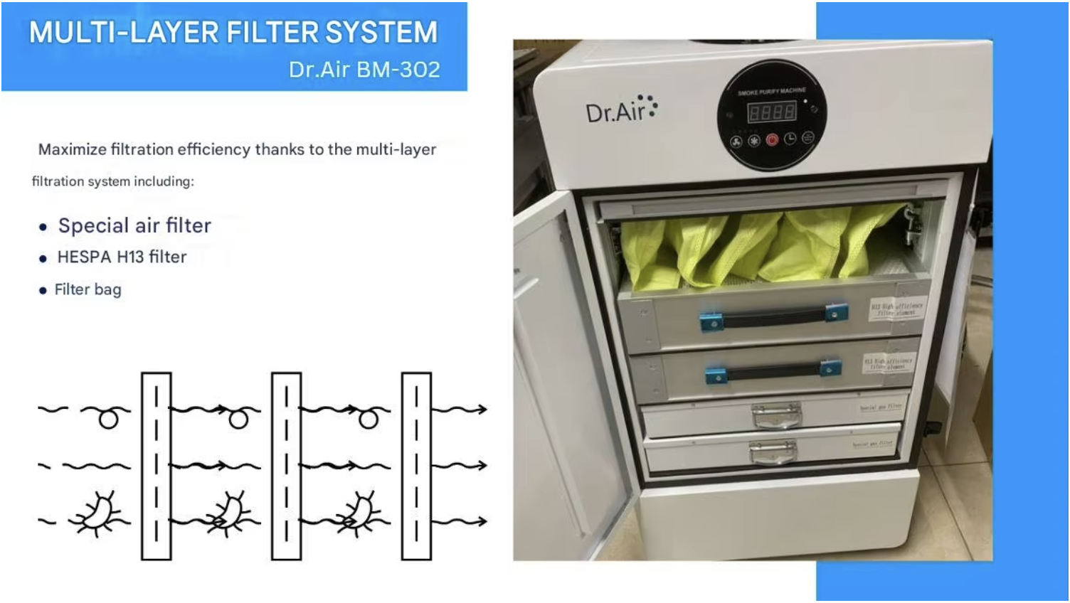 The Dr.Air BM-302 operates on a multi-stage filtration principle to ensure a safe working environment: