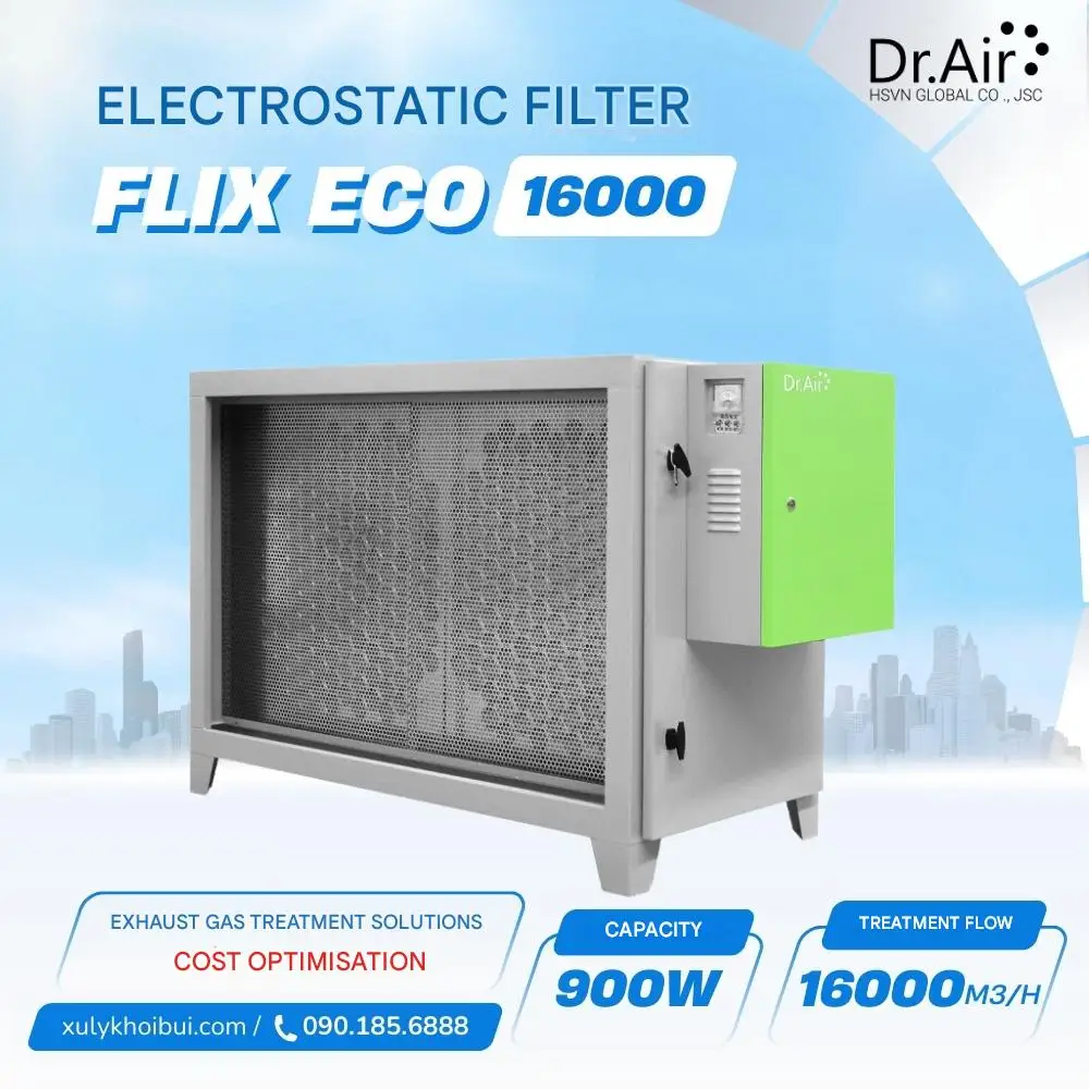 Dr.Air FLIX ECO-16000 electrostatic air purifier is a powerful air purifier, designed to handle large volumes of exhaust air in industries and services. With the ability to effectively remove fine dust particles, smoke, and grease, the machine helps protect the environment and human health.