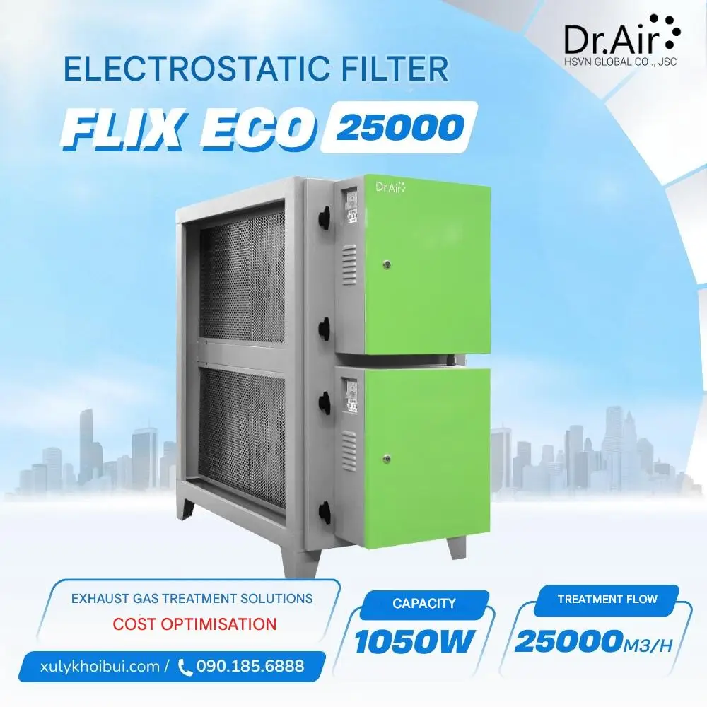 Dr.Air FLIX ECO electrostatic filter treats smoke and dust based on the principle of electric field. First, the power source will provide a large current, at the electrostatic filter, the electrodes create an electromagnetic wave field. Smoke and dust particles passing through the high electric field are ionized into charged molecules. These charged particles passing through the filter with opposite charges will be retained on the surface while the clean air will go out through the pipe. Based on this principle, electrostatic filter technology is considered a leading method of exhaust gas treatment today.