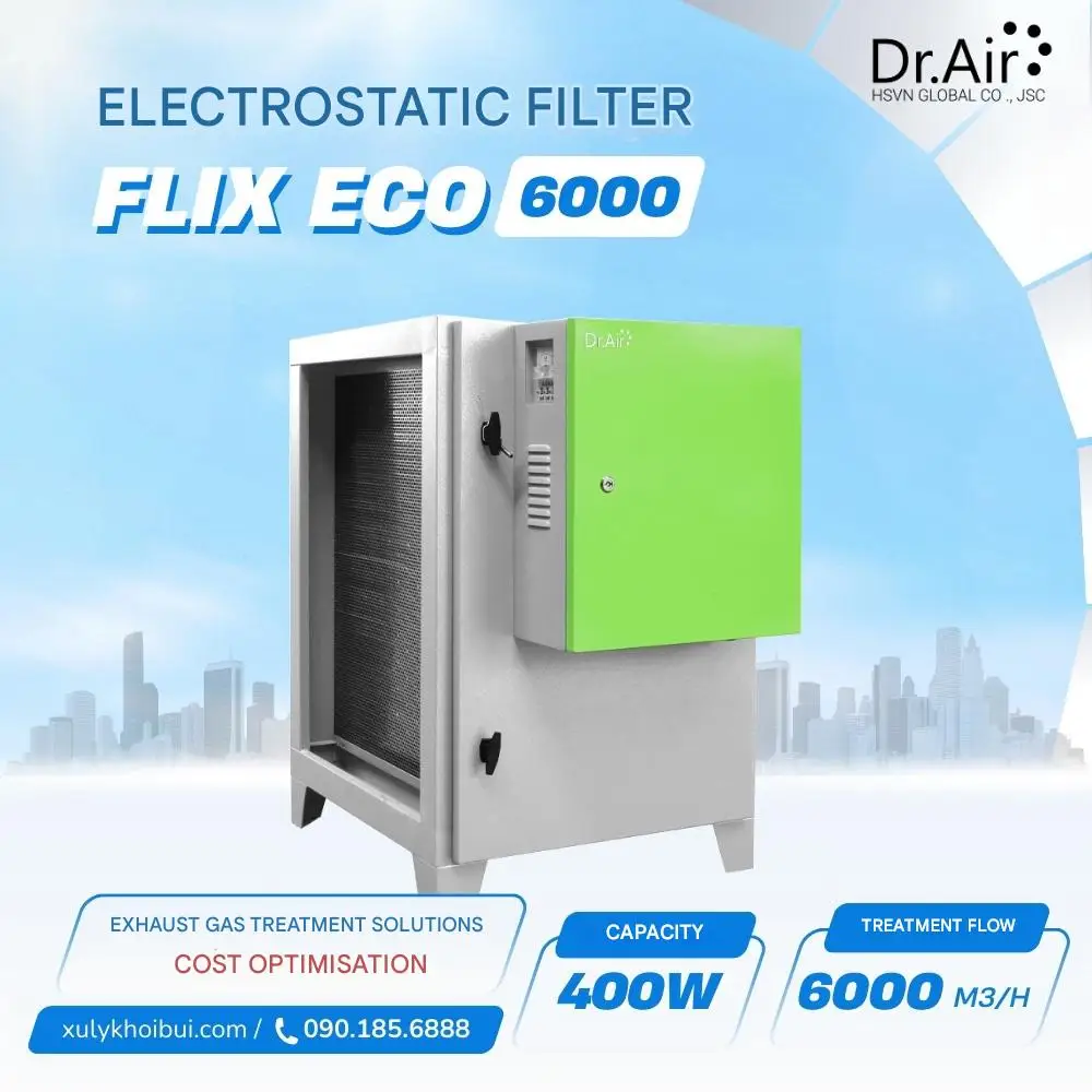Dr.Air FLIX ECO-6000 electrostatic filter is a small capacity, tube-type electrostatic filter of Dr.Air. The machine is suitable for treating smoke in industrial kitchens and exhaust gas of industrial zones. The machine applies advanced electrostatic filter technology to remove most of the smoke and dust at a reasonable price, so it is trusted by customers.