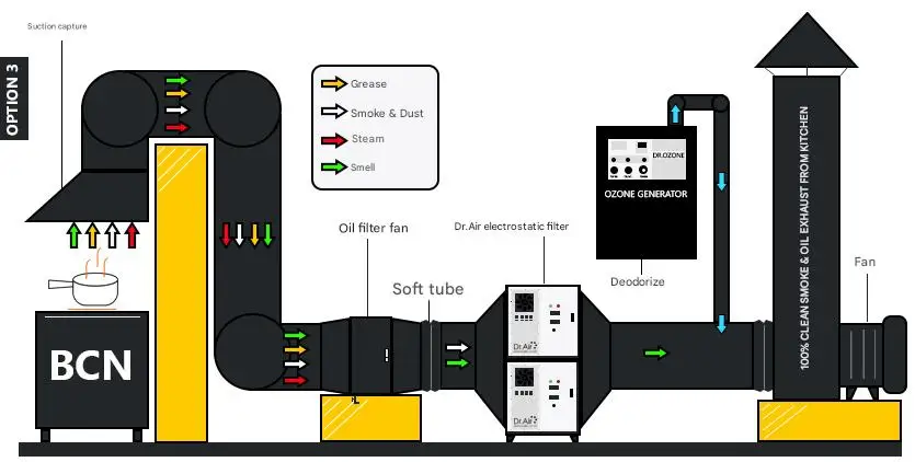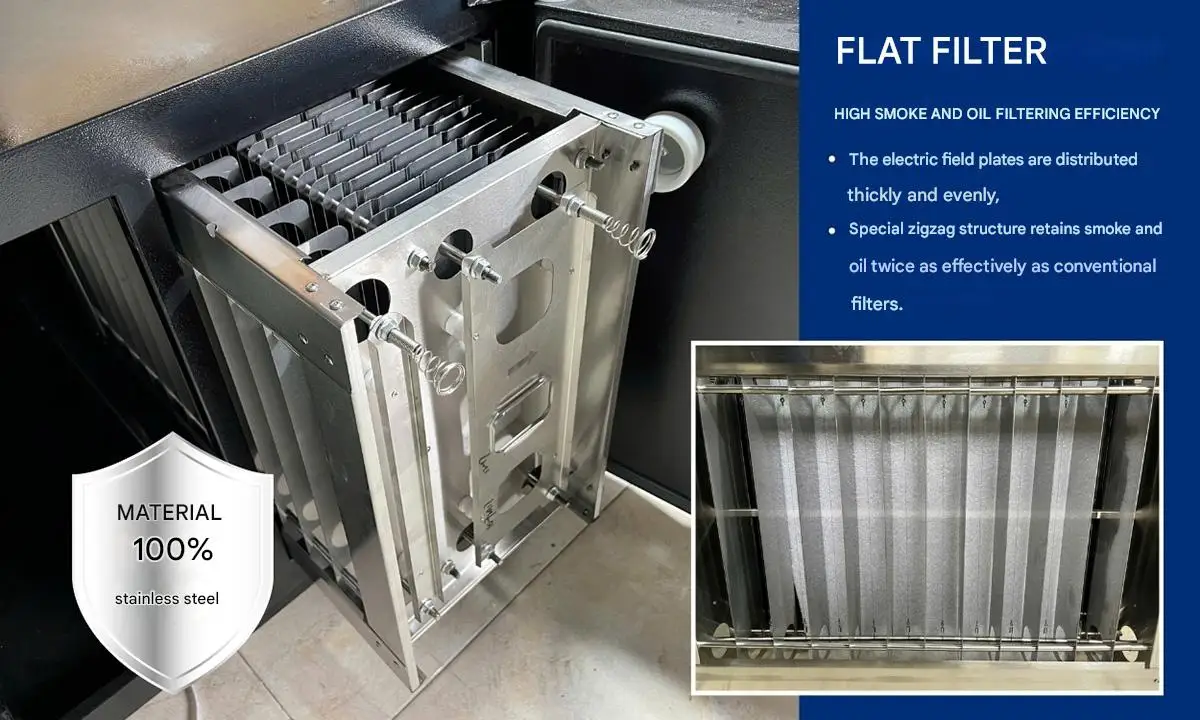 Result: A perfect solution with 98% – 100% efficiency. The discharged air is odorless, smokeless, and free of grease buildup in the ducts, ensuring fire safety.