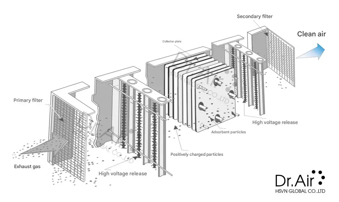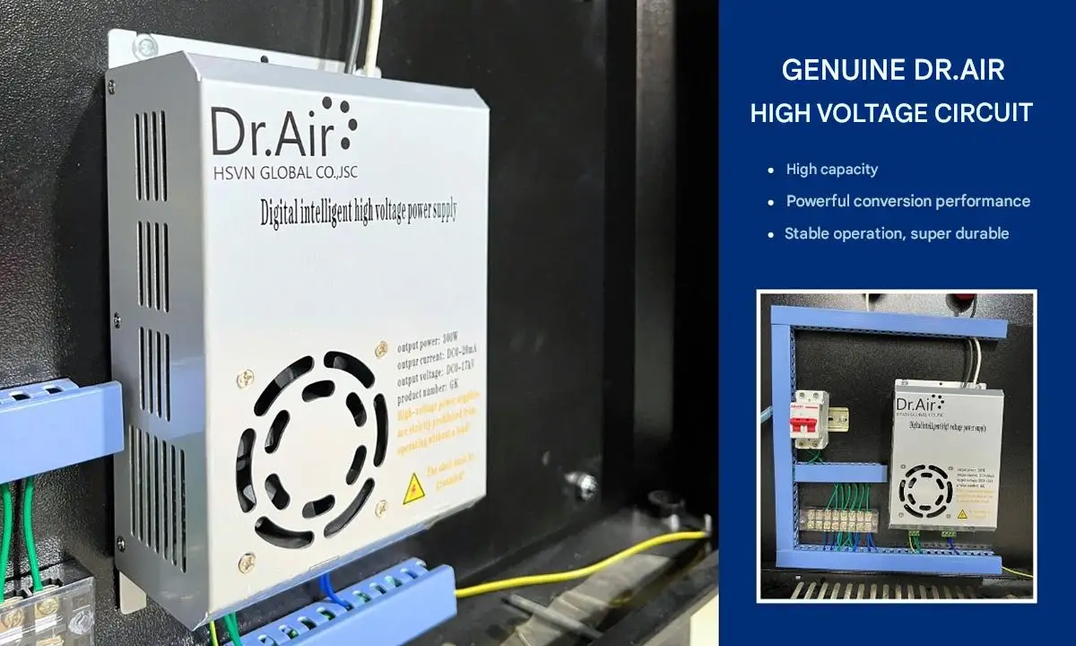 The Dr.Air KT10000 Electrostatic Precipitator (ESP) is engineered with a high-efficiency configuration featuring electrostatic filter cells arranged horizontally, controlled by a unified system.