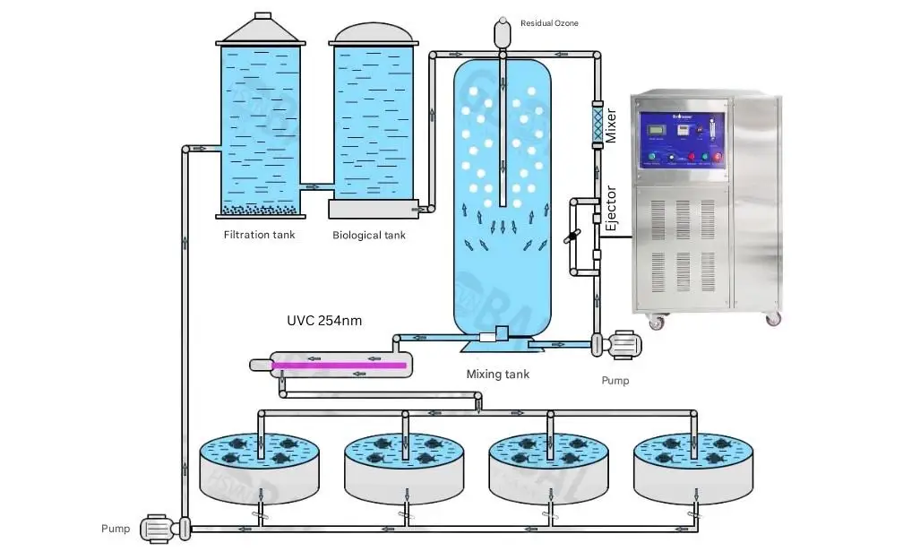 Ozone is an ideal technology for sterilization and the removal of bacteria, viruses, and dissolved organic matter in recirculating aquaculture systems (RAS).